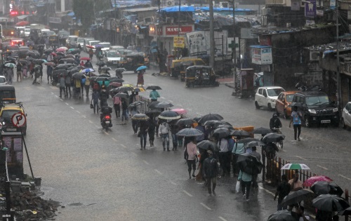 印度半岛西海岸的孟买(北纬22度、东经73度)是印度最大的都会区,是典型的热带季风气候,年平均气温27.3℃,气温最低月(1月)月均温24.3℃,气温最高月(5月)月均温29.9℃;孟买多年平均年降水量2078毫米,全年降水的90%集中在6-9月(这4个月的月降水量均在200毫米以上);孟买雨季经常出现大雨、暴雨天气,过多的降水易引发洪灾。