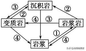 其实,判读关键是在整个物质循环过程中,抓住四种物质:岩浆、岩浆岩、沉积岩和变质岩;四种作用力:上升冷却凝固、外力作用(包括风化、侵蚀、搬运、沉积和固结成岩)、变质作用和重熔再生。
