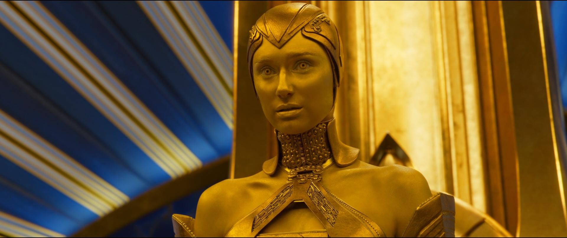 比如《银河护卫队2》,她饰演索维林族的阿耶莎大祭司,和星爵就造人问题进行了一番略显内涵的短暂讨论。