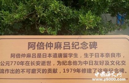 碑正面刻有“阿倍仲麻吕纪念碑”八字,背面镌刻其事迹,柱顶四侧是表现中日友好的樱花、梅花浮雕,柱基是采用莲瓣雕饰,柱板上刻日本遣唐使船浮雕,两侧分别是李白《哭晁卿衡》诗和阿倍仲麻吕《望乡》诗,具有深邃的中日文化内涵。