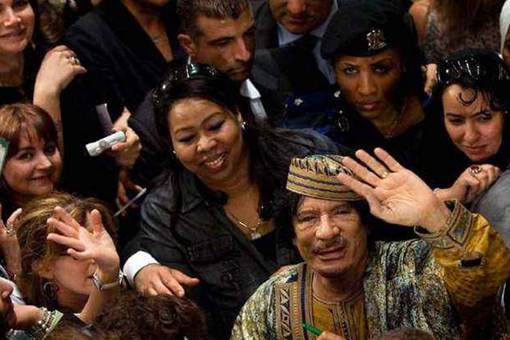 在美女围绕下的卡扎菲出场时是极为拉风的,大有皇帝出行的阵容。据说这和他曾经在皇宫工作有一定的关系,大概是被皇家阵容深深打动了吧。