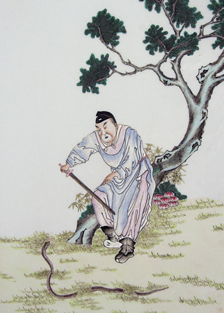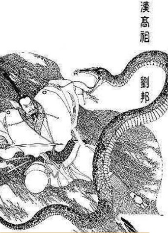 汉高祖刘邦做沛县亭长的时候,为县里押送一批农民去骊山修陵。途中大部分人都逃走了。刘邦自己度量,即使到了骊山也会被按罪被杀。于是走到丰县西的涸泽地带就停下来,饮酒大醉,夜里干脆就把剩下的所有农民都放了。并且对他们说:“你们都走吧,我从此也要逃跑了。”这些农民中愿意跟随刘邦的有十多个。刘邦带醉行走在丰西泽中,让一个农民在前面探路。这个人回来说:“前面有一条大蛇挡路,我们还是回去吧”。刘邦趁着酒劲说:“大丈夫独步天下有什么害怕的!”于是走到前面拔剑将蛇斩断。蛇从正中间被分为两段。走了几里地,刘邦醉得倒下睡着了。刘邦队伍中走在后面的人来到斩蛇的地方。看见一个老太太在路边连夜放声啼哭。问她为什么这样伤心,说:“我儿子被人杀了,所以痛哭”。问她儿子为什么被杀,说:“我儿子是白帝子,变成蛇横在路上,被赤帝子杀了,所以我很伤心”。人们以为她胡说八道、散布谣言,想打她,这个老太太突然不见了。后面的人赶到前面,刘邦才醒过来,人们报告了他这一情况。只有刘邦心里觉得很高兴,心生自豪感,跟随他的人越来越敬畏他。秦始皇曾经说:“东南方向有天子气”。于是亲自东游来验证,刘邦怀疑秦始皇说的就是自己,就躲了起来,藏到荒凉的芒砀山的深山老林中。吕雉和其他人都寻找他,每次都能在人迹罕至之处找到。刘邦觉得奇怪,就问是怎么回事。吕雉说:“你在的地方头上总有云气凝结,所以我们根据这一现象总能找到你”。刘邦听了很高兴,沛县中的人知道后,许多人都来归附刘邦。