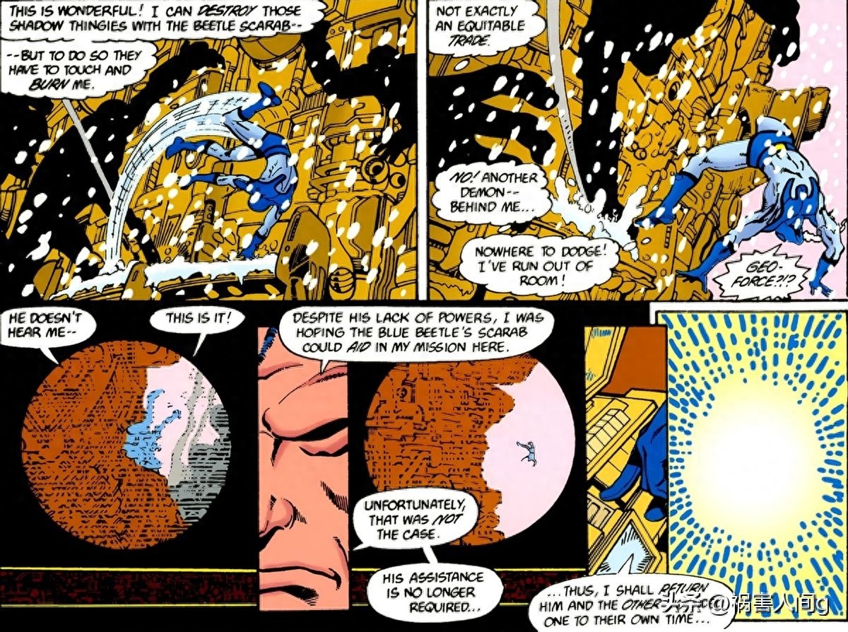 在1985年,DC退出了大事件《无限地球危机》,反监视者开始摧毁多元宇宙,多元宇宙中只剩下包括地球四在内的五个平行宇宙。由于圣甲虫能够毁灭反监视者的暗影怪物,所以监视者招募了泰德,但是混乱中,泰德失去了圣甲虫,监视者将泰德送回了自己的世界。