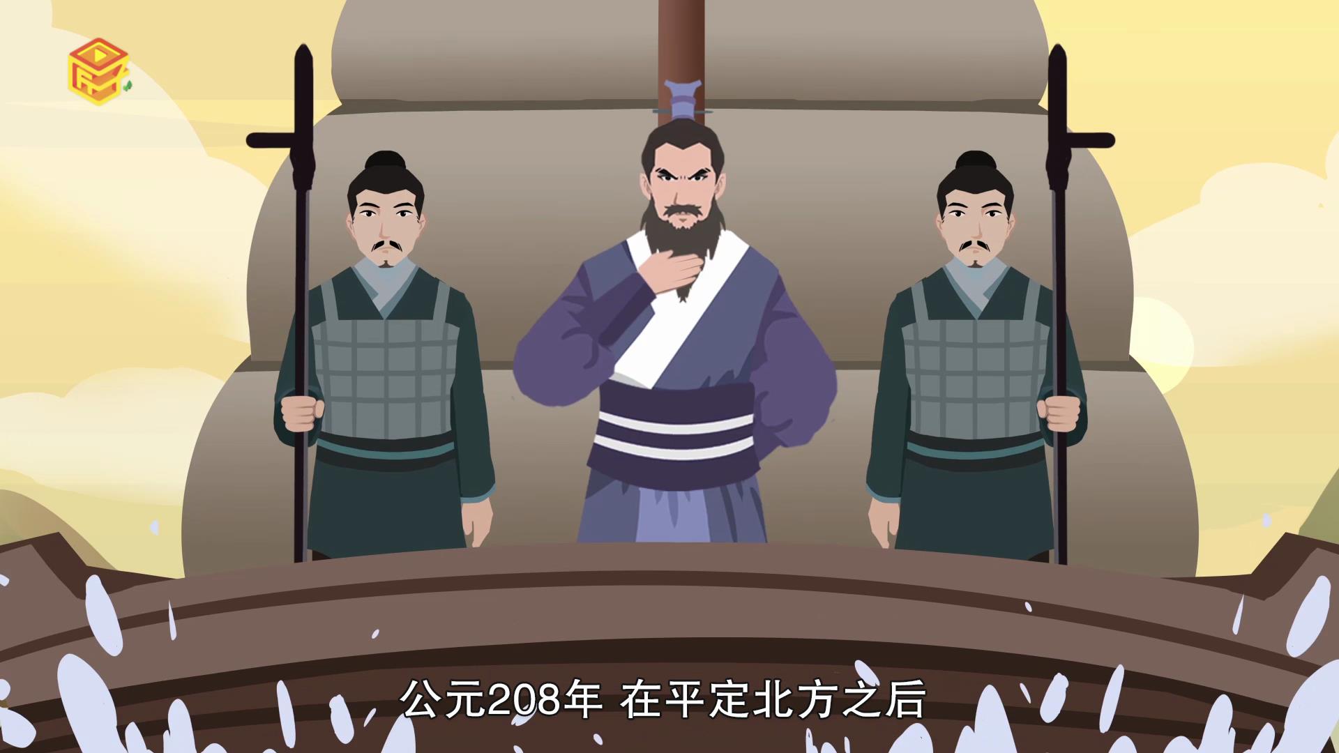 公元208年,在平定北方之后,曹操率水陆八十万人马准备南征。经过一番商议,孙刘两家决定联手共同抵抗曹操。同年十二月,孙刘联军逆水而上,行至赤壁,与正在渡江的曹军相遇。曹军把战船靠到北岸乌林一侧,周瑜则把战船停靠南岸赤壁一侧,两军隔江对峙。由于曹军当中大多都是北方人,不习惯水上作战。于是,曹操就命人用铁链将船连接起来,人和马在船上能自由的行走。见此情况,诸葛亮和周瑜将计就计,制定了诈降加火攻的策略。老将黄盖趁着东南风急,带着10艘装有干草和枯柴的船只前去投降。在接近曹营时,黄盖下令点燃了船舱,让船顺风而行,直逼曹军。曹军将士见此情况,乱作一团。东南风助长了火势,顷刻间曹军人马烧死和淹死的不计其数。趁此机会,孙刘联军派精锐出击,大破曹军。