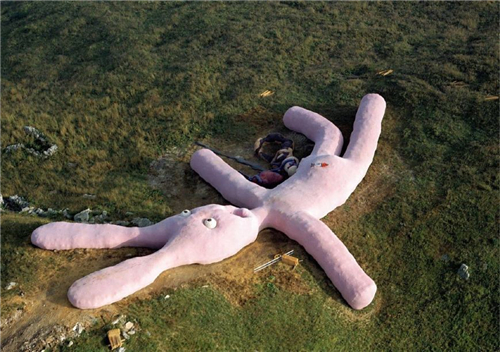 阿尔卑斯山旁边平躺着一只巨型粉色的可爱兔子。这个兔子是阿尔卑斯山的著名景点。这个平躺在意大利的阿尔卑斯山上的淡粉色兔子,是艺术家们花费5年时间,斥巨资打造的作品。