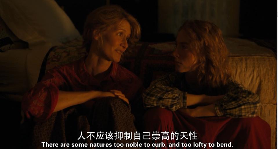 马奇太太在与乔的倾心交谈中说了一句话,是她对孩子的教育理念,也是电影的一个旨意。她说:“人不应该抑制自己崇高的天性。”她这样教导孩子,也如此以身作则。