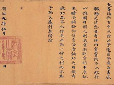 顺治元年四月,顺治帝在笃恭殿拜多尔衮为大将军,亲赐大将军敕印,令他统大军南下,入关与李自成和南明王朝开始了争夺天下的宏伟事业。手握大清大军的多尔衮,迅速成为大清王朝实际上最高统治者,把持朝政、权倾中外,权势凌驾于顺治皇帝之上,并获封“皇父摄政王”,形成了对顺治皇权的实质性威胁和挑战。