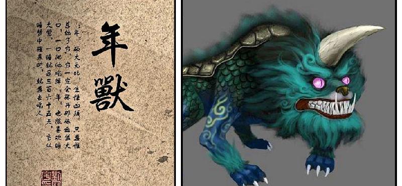 这种头长触角、尖牙利齿、目露凶光、暴虐异常;头大身小、身长十数尺、眼若铜铃、来去如风;嗷叫时发出“年”的声音的怪兽,名“年兽”。