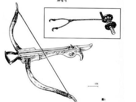 弩是有臂的弓,自先秦时期以来就是中国主要的远程兵器。弩与弓的区别是在弓的后部装有弩机。一般弩机四周有“郭”,“郭”中有牙,可钩住弓弦。郭”上有“望山”作为瞄准器,“牙”下有“悬刀”作为扳机。发射时,扳“悬刀”,“牙”缩下,“牙”所钩住的弦弹出,弦向前运动弹击箭杆使箭激射而出。