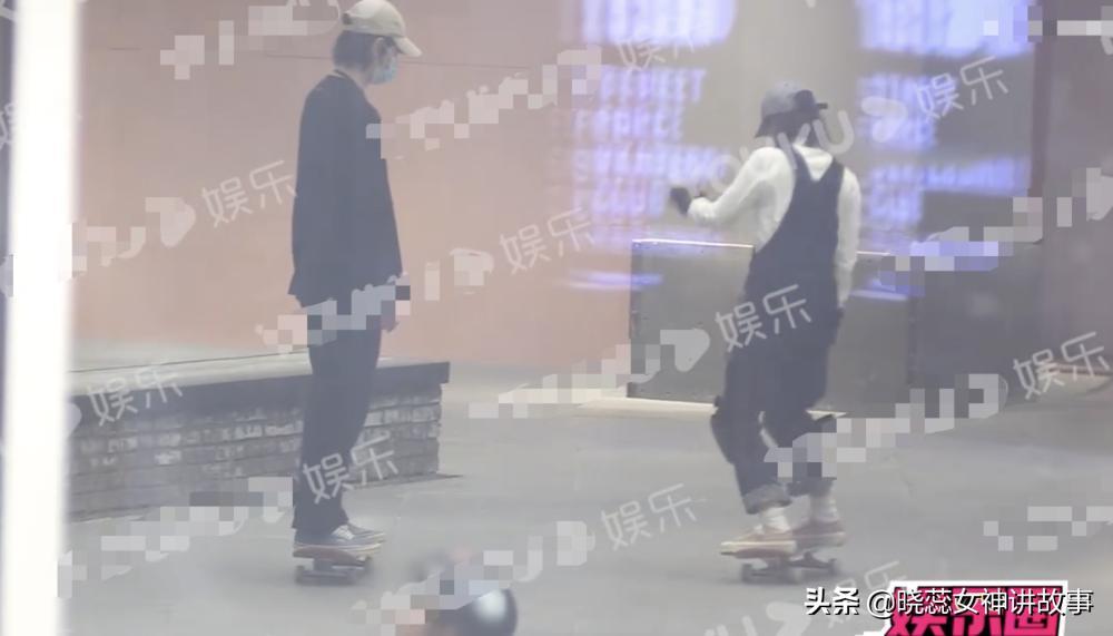 后来就拍到沈月与男友玩滑板的画面,男生比较专业,沈月比较生疏,他们就一个教着一个学着,互动十分亲密。