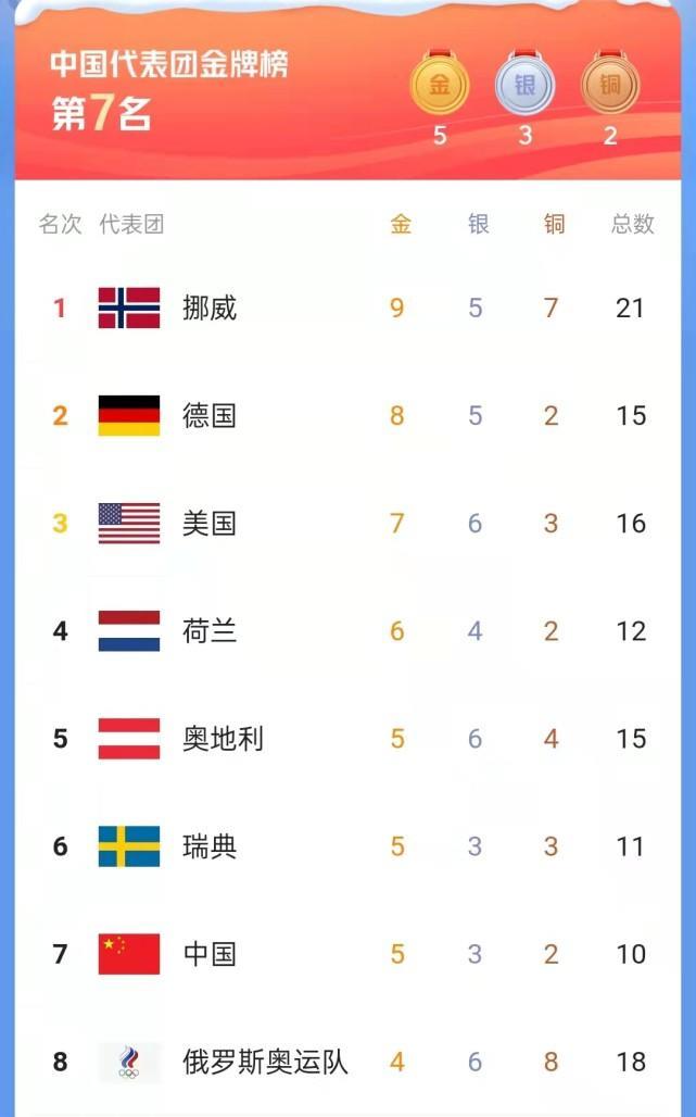 冬奥会最新金牌榜:中国金牌数追平历史,韩国1金,美国后来居上
