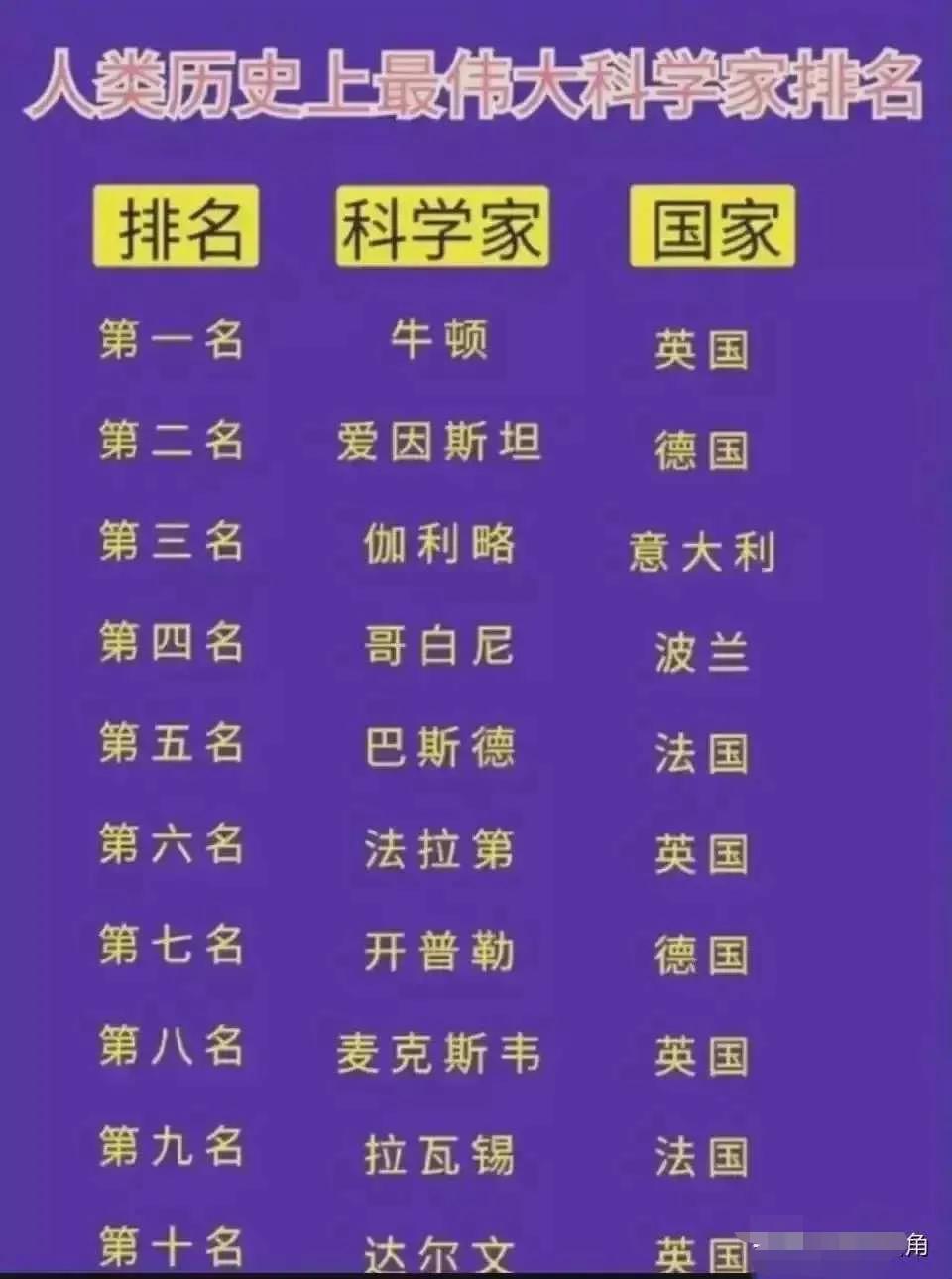 这是人类历史上最伟大十个科学家:爱因斯坦第2,法拉第第6,达尔文第10。