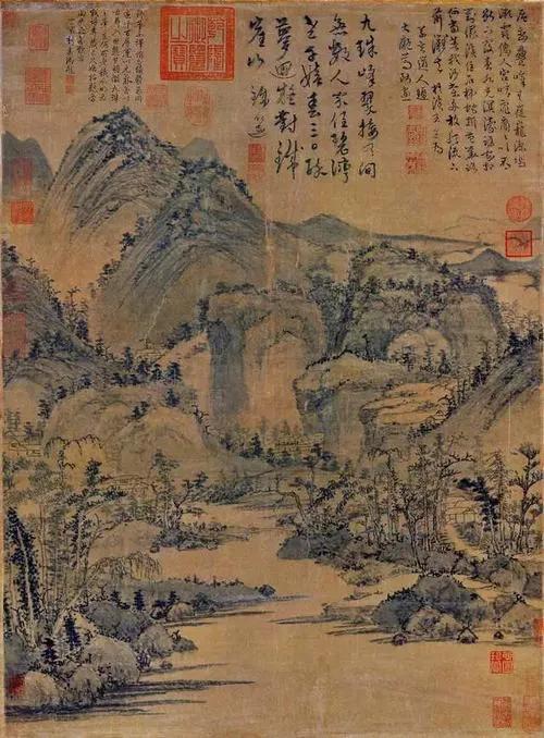 董其昌,1555~1636年,明朝后期大臣、书画家,擅于山水画,师法于董源、巨然、黄公望、倪瓒,笔致清秀中和,恬静疏旷;用墨明洁隽朗,温敦淡荡;青绿设色,古朴典雅。