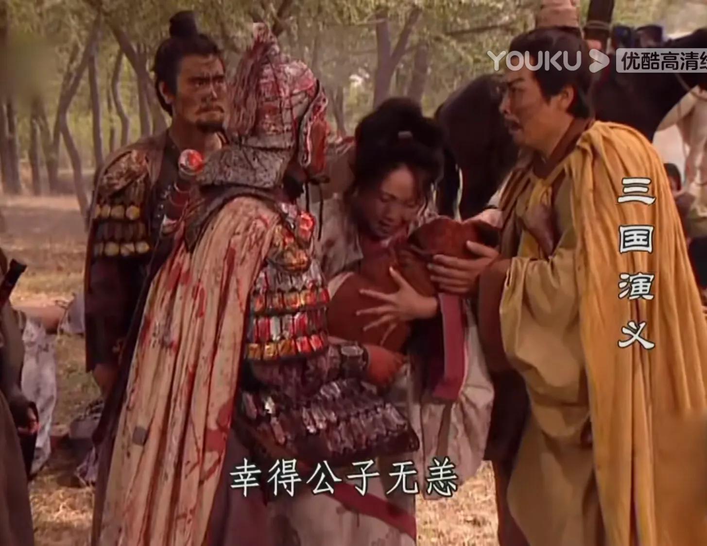 赵云冲出曹军重围,成功救出阿斗之后,浑身是血的赵云将阿斗交给刘备。刘备接过阿斗后,看了阿斗片刻,刘备即将阿斗摔在地上说:“为汝这孺子, 几损我一员大将”,好在赵云及时安全地接住了孩子。