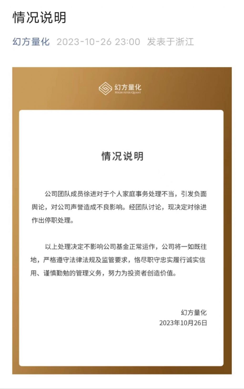 10 月 26 日,幻方量化在官方公众号发布情况说明称,公司团队成员徐进对个人家庭事务处理不当,引发负面舆论,对公司声誉造成不良影响。经讨论,其决定对徐进作出停职处理。