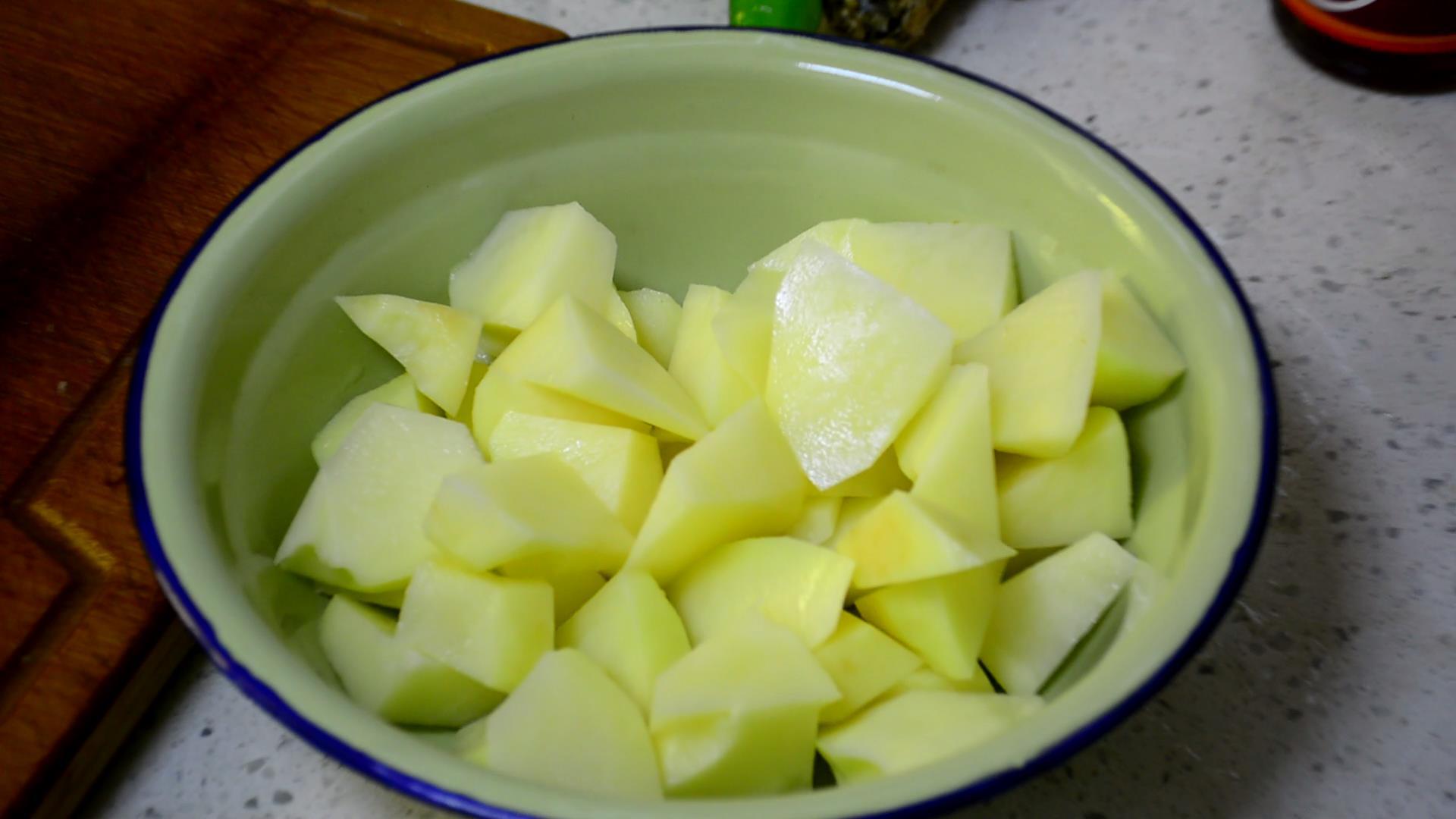 1、把土豆洗净去皮后切成滚刀块,当然也可以切成厚片,改刀的方式根据自己的喜好来就可以,切成块成菜更好看,切片的话更容易熟。