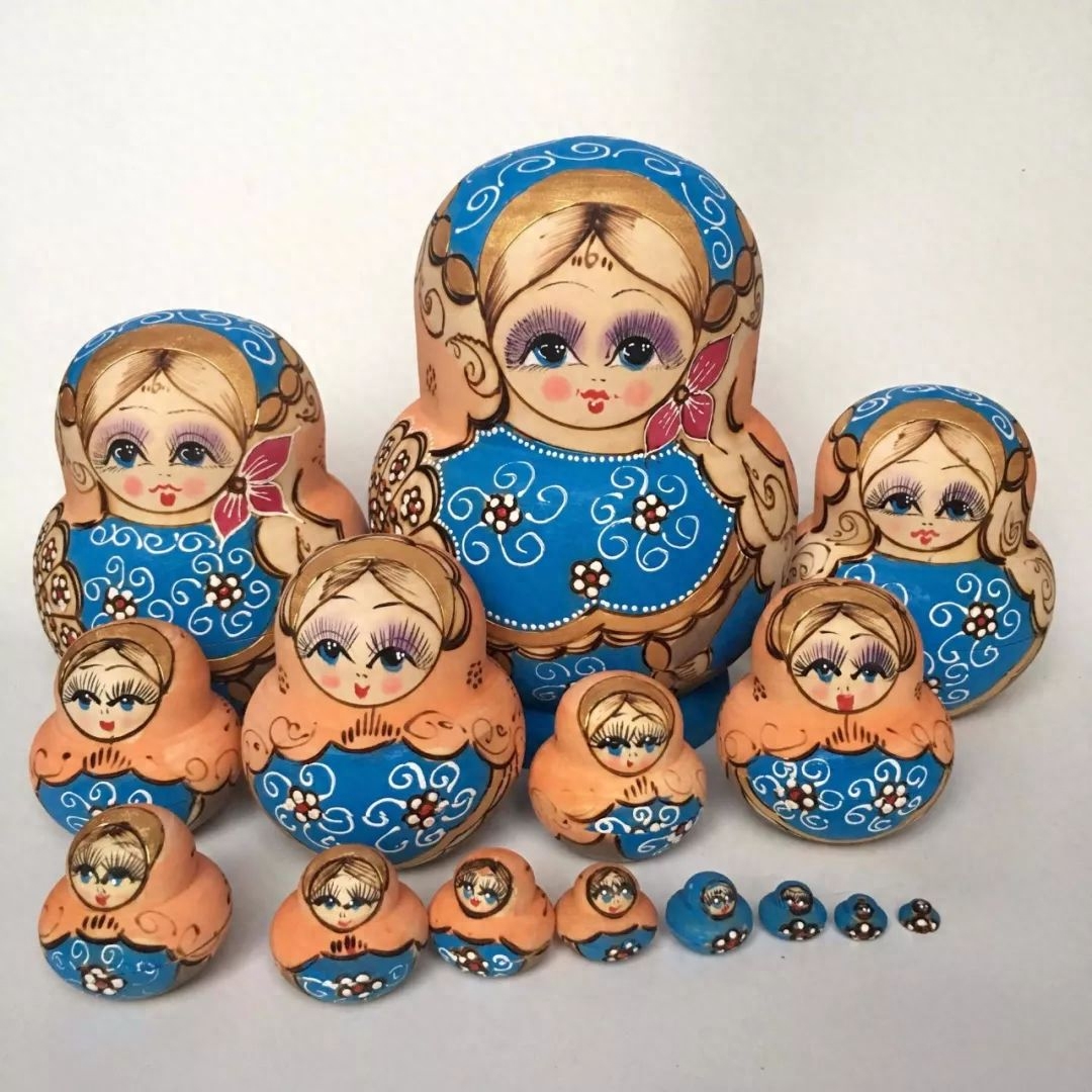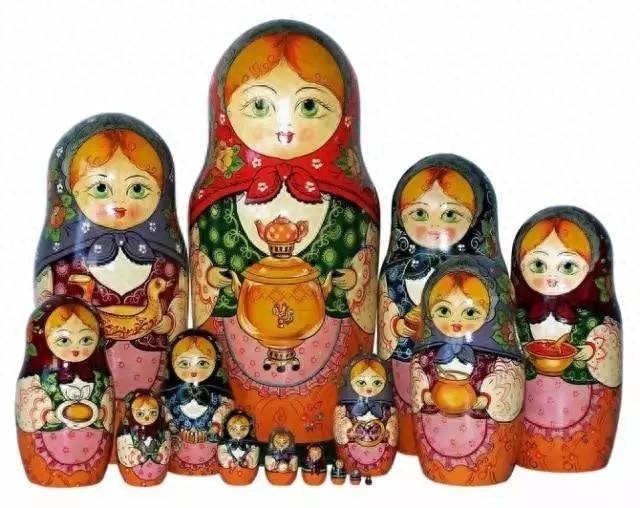 俄罗斯套娃是俄罗斯特产的木制玩具,一般由多个一样图案的空心木娃娃一个套一个组成,最多可达十多个,通常为圆柱形,底部平坦可以直立。颜色有红色,蓝色,绿色,紫色等。最普通的图案是一个穿着俄罗斯民族服装的姑娘,叫做“玛特罗什卡”,这也成为这种娃娃的通称。