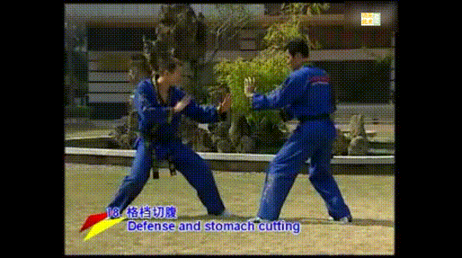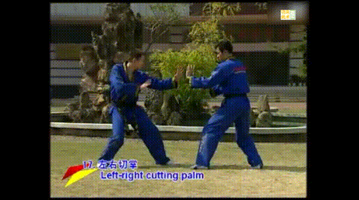 敌我双方均以左虚步护身掌姿势相互对峙;敌方以左弓步右劈拳劈击我方头部或颈部,我方以左虚步左格手防守;敌方再以左弓步左冲拳击我面部,我方则向左转身90度侧身闪躲,同时以马步右手外格挡防守,并以马步左切掌砍切敌方头部;随即我方再以左骑龙步右切掌砍切敌方左肋。