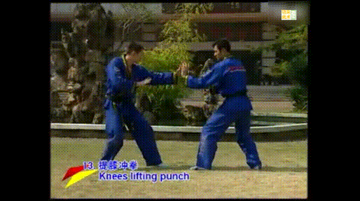 敌我双方均以左虚步护身掌姿势相互对峙;敌方向前滑步,以左弓步左冲拳攻击我方头部;我方以左虚步右臂外格挡防守;随即提左膝防止敌方右腿进攻,提膝也可起到虚晃一招的作用,诱导敌方以为我方会以左腿进攻而将其注意力吸引到我方下盘,此时我方趁机以上盘的左冲拳攻击敌方面部;紧接着,我方右腿向前落步,再以左骑龙步右冲拳进攻敌方腹部。