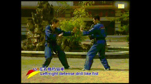 敌我双方均以左虚步护身掌姿势相互对峙;敌方向前滑步,以左弓步左冲拳攻击我方头部,我方以左虚步右格手防守;敌方再以左弓步右冲拳继续进攻我方头部,我方则以左虚步左格手防守;我方随即向前滑步以左弓步右钻拳(勾拳)击打敌方腹部。