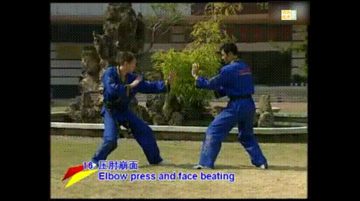 敌我双方均以左虚步护身掌姿势相互对峙;敌方以左弓步右劈拳劈击我方头部或颈部,我方以左虚步左格挡防守;敌方再以左弹腿进攻我方腹部,我方则屈右臂以左弓步右压肘向下格挡敌左腿,随即我方顺势向前滑步近身,以左弓步右翻背拳崩击敌方面部。