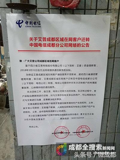 下午3点,记者来到位于桂王桥西街66号的四川艾普宽带网络股份有限公司成都分公司,该公司门口张贴了《关于艾普成都区域再往客户迁转中国电信分公司网络的公告》,公告中表示,鉴于四川省艾普网络股份有限公司资金链断裂,2018年3月31日后,无法持续提供通信服务。经省通信管理局同意,艾普宽带现有用户从12月30日起,转移至中国电信成都分公司网络,并由中国电信提供相应配套政策,保障持续通信服务。