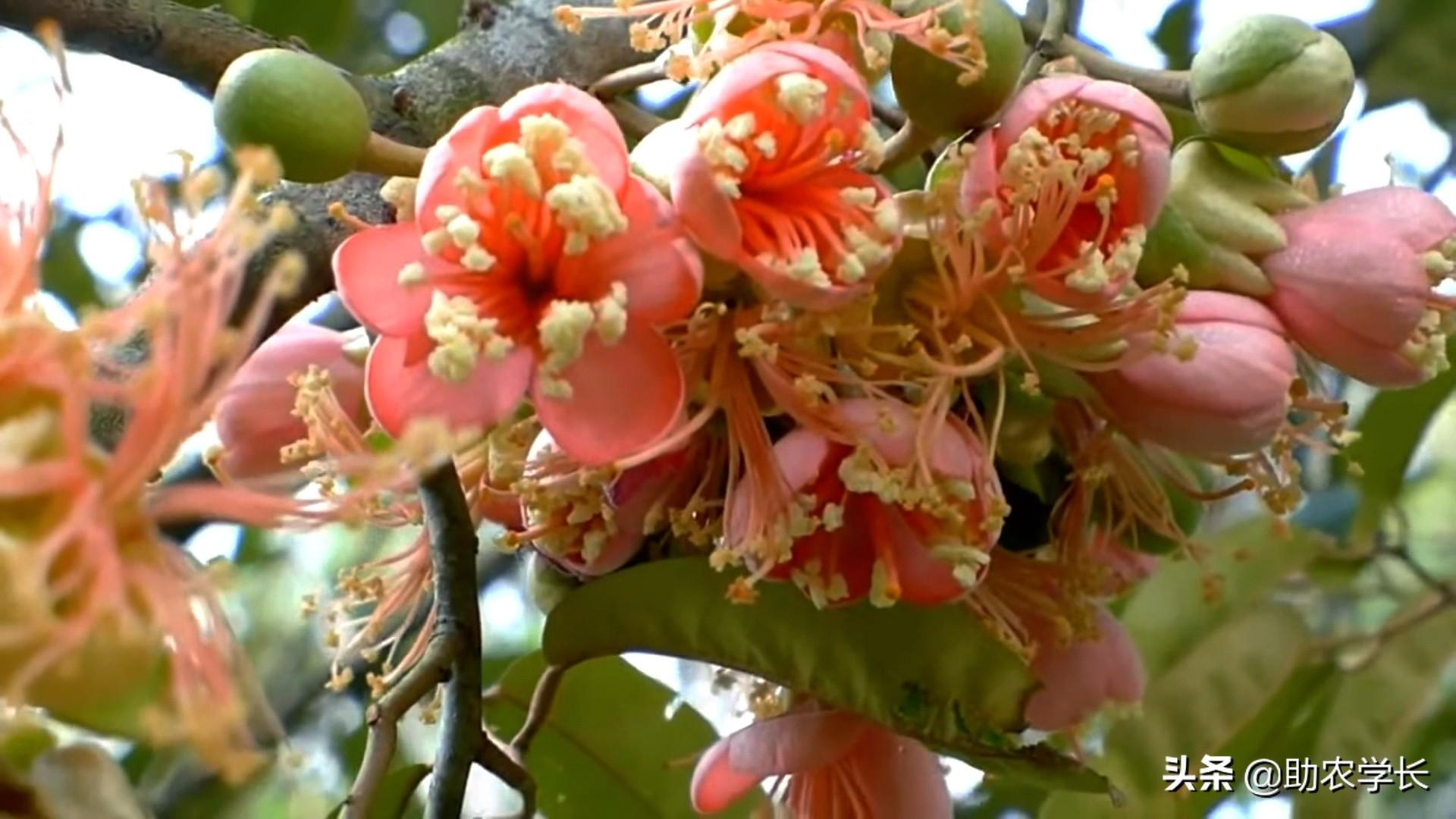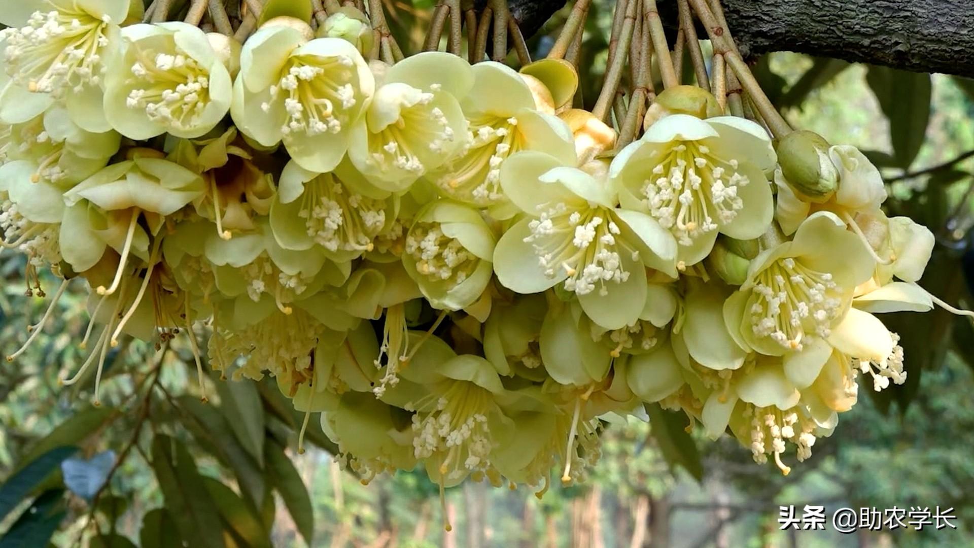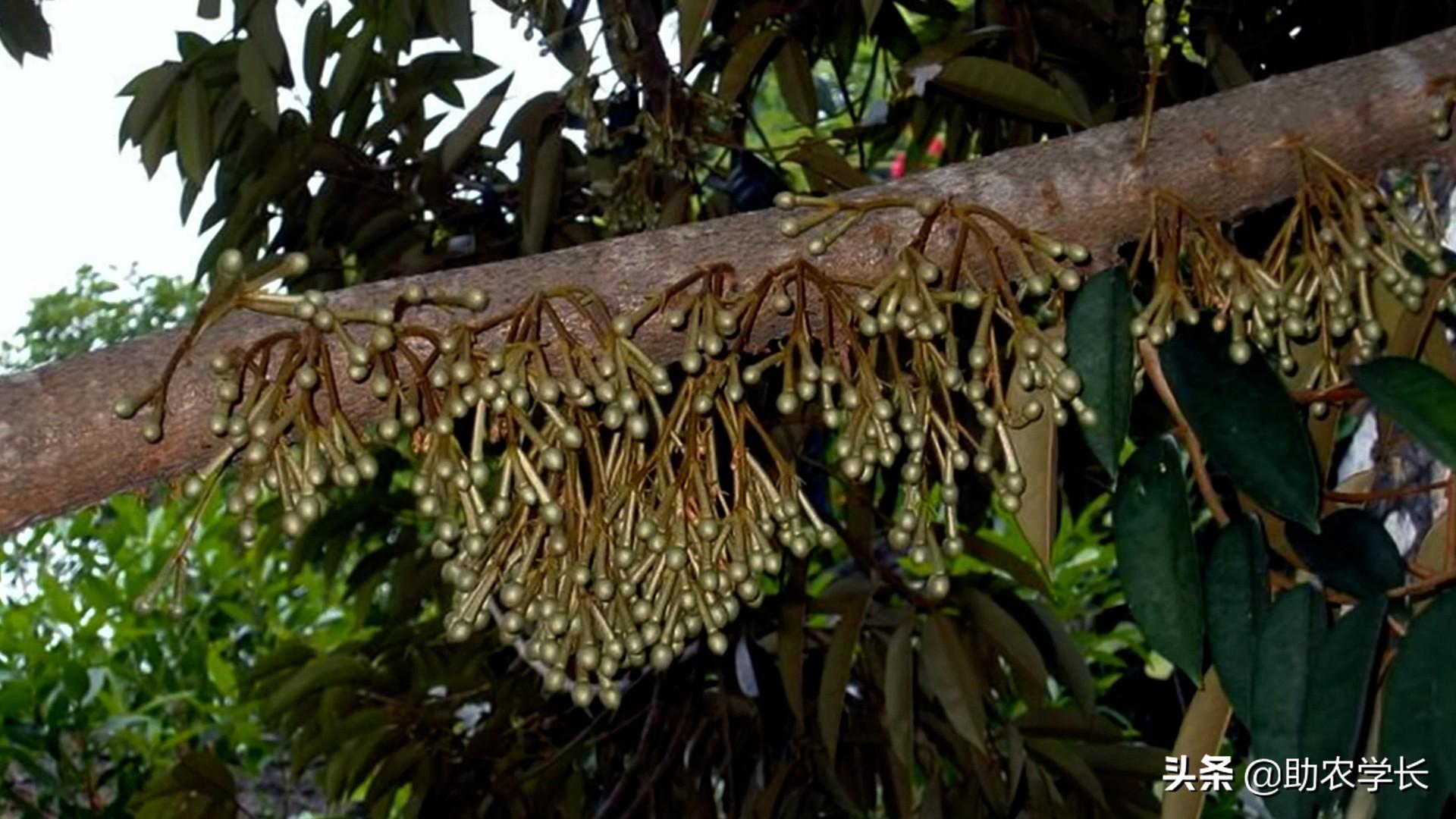 这些还不是榴莲果实,它们只是花苞,再过上一个月,它就会开出美丽的花朵,一束一束地长,根据不同的品种,开出来的花,颜色也会有所不同。