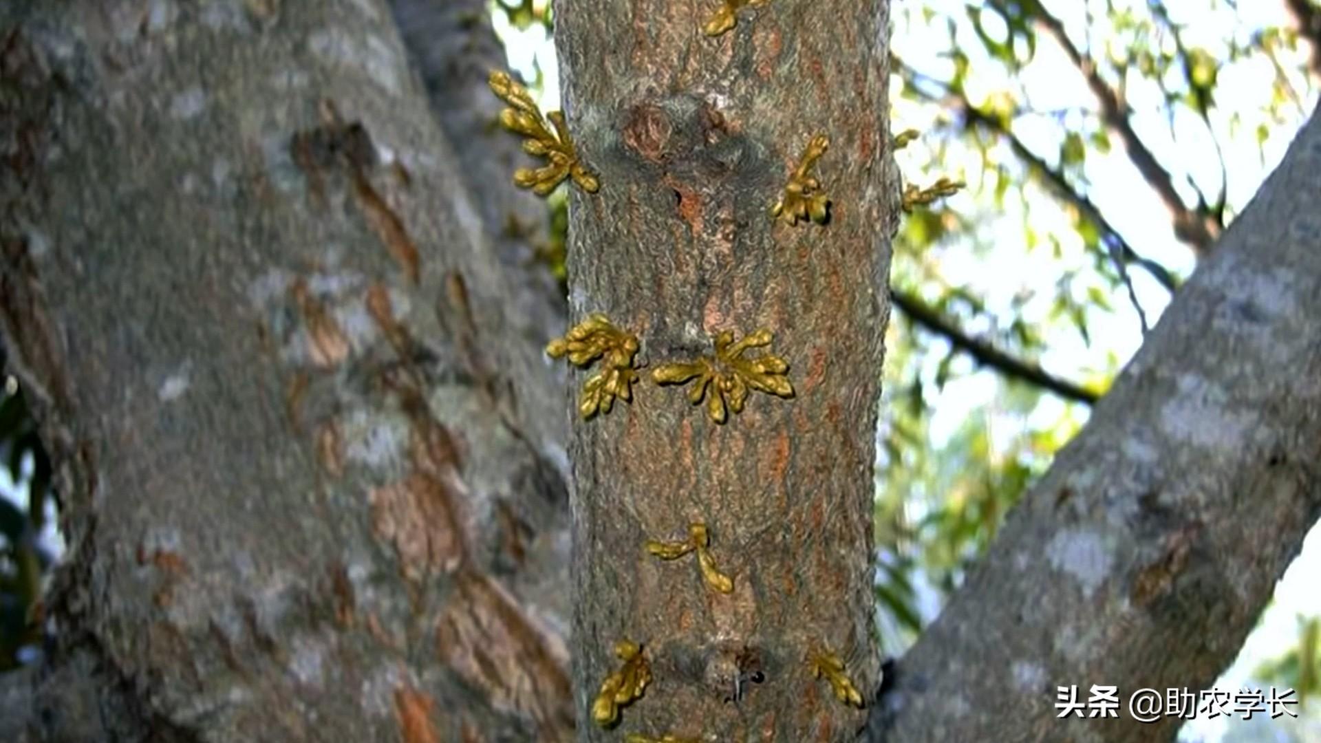 榴莲种植过程也要精心打理,不仅要防病虫害,也要定期科学施肥,榴莲树的花是长在树干上的,像是一坨坨的黄绿色的树芽。