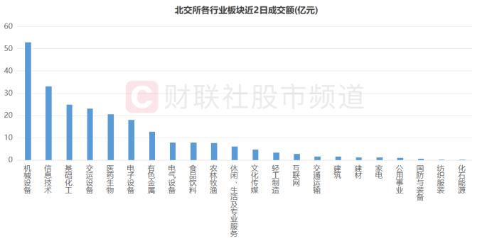 近日,北交所市场交投数据重回百亿,部分方向也成交火爆,分行业板块来看,以本周(12 月 4 日至 5 日)数据统计,不计算周内上市的新股,机械设备、信息技术、基础化工、交运设备、医药生物、电子设备、有色金属板块近 2 日成交额数据居前,而化石能源、纺织服装、国防与装备、公用事业、家电、建筑、交通运输板块的交投活跃度相对偏冷。