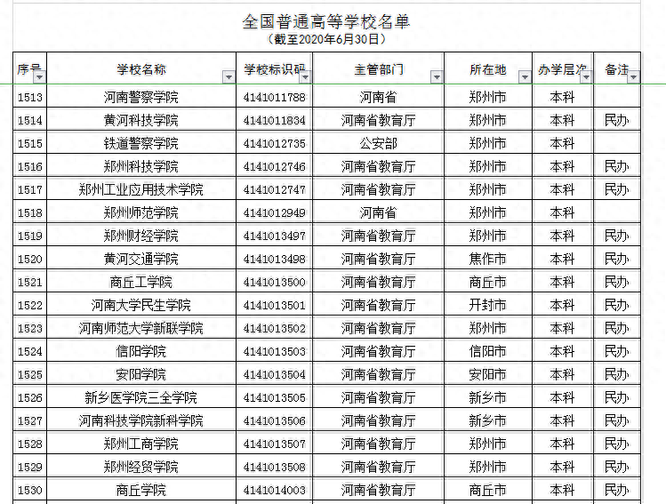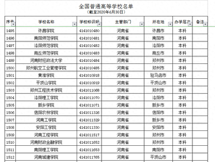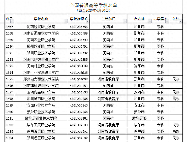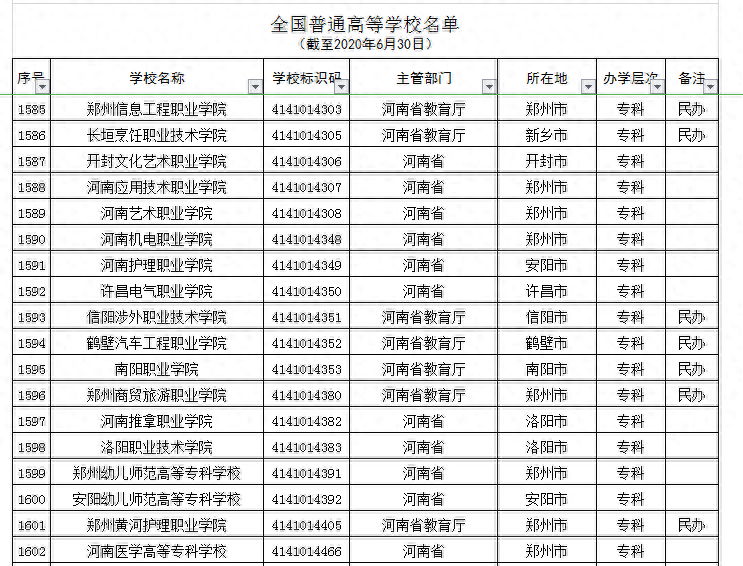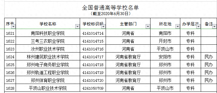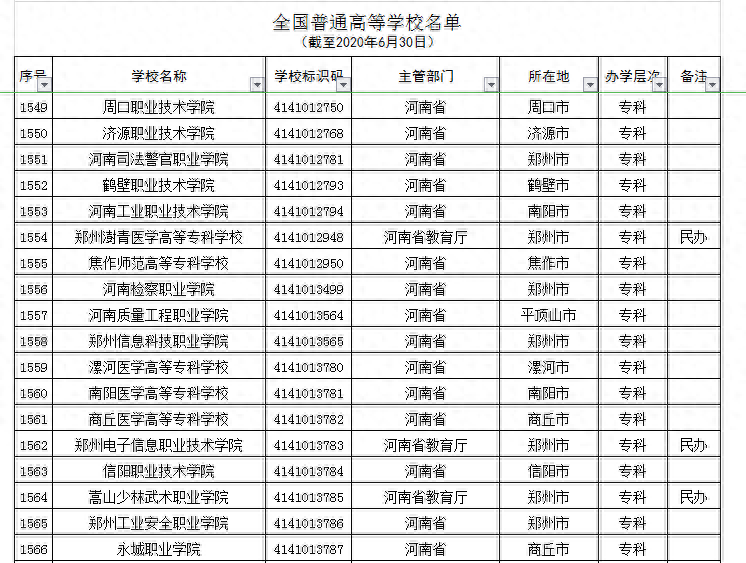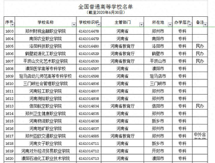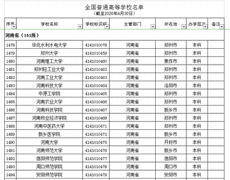至2020年6月30日,教育部公布的2740所全国普通高等学校中,河南省有151所: