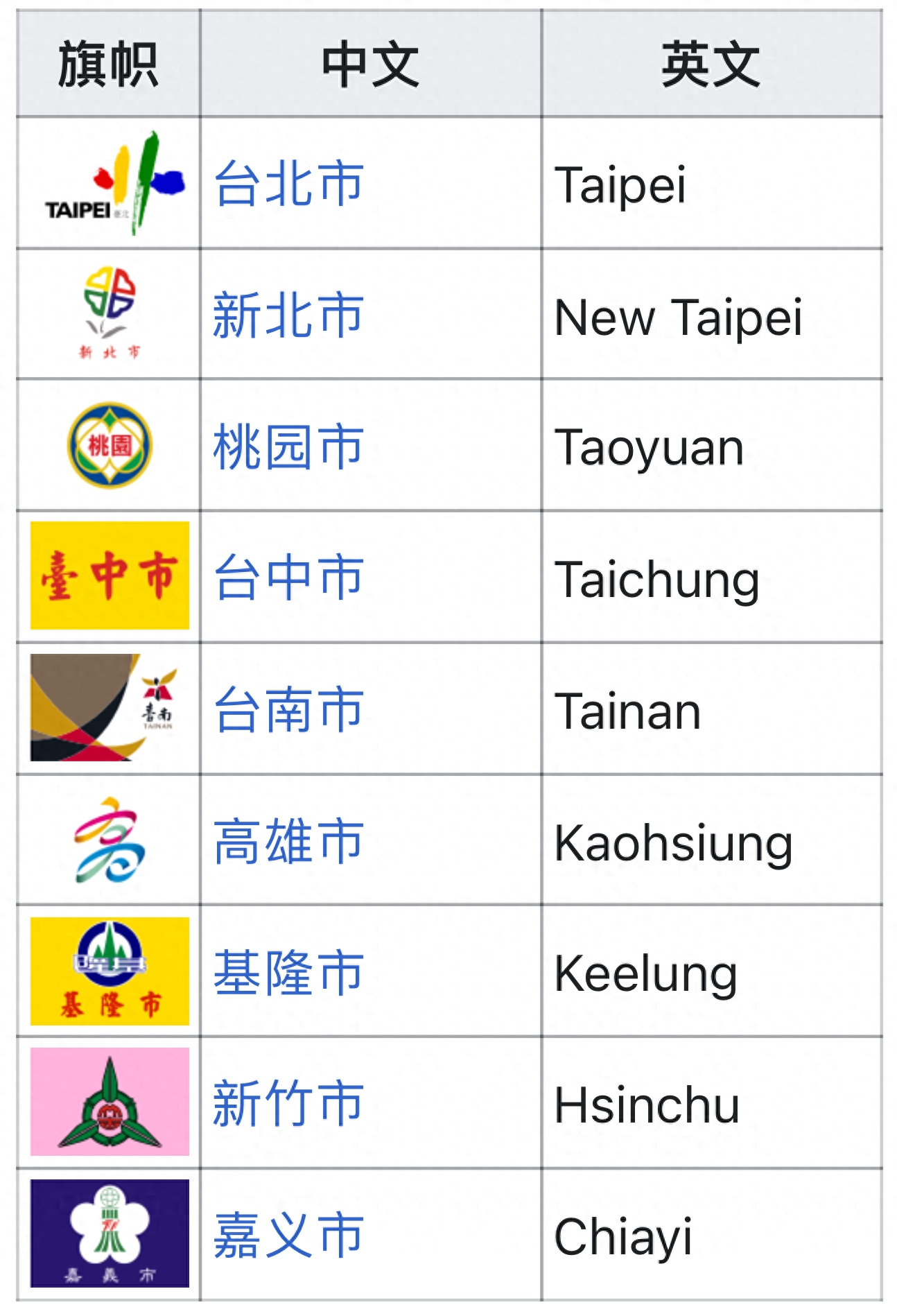 虽然大陆也有过城市市旗,比如南京,上饶,哈尔滨等,但最终目前是没有城市存在市旗的。然而台湾省各市以及各县还是拥有市旗。下面是现使用的城市市旗。