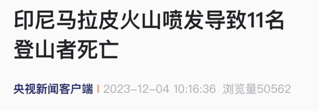 据央视新闻客户端报道,印尼救援人员当地时间 12 月 4 日消息,印尼马拉皮火山 3 日喷发已造成 11 名登山者死亡。