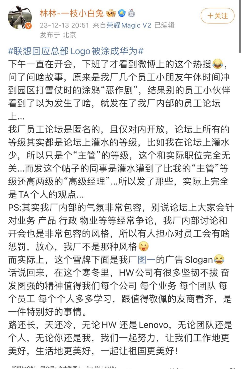 三言科技消息 今日,联想员工将门口 " 雪牌 " 上的 LOGO 涂鸦成 "Huawei",且在内部论坛号召举报、严处涂鸦员工。该事件引发热议。