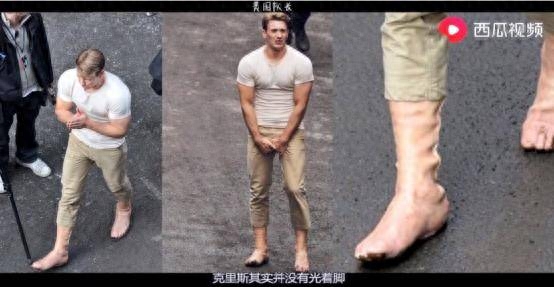 在电影中厄斯金博士研制出了特殊的血清,刚给美队注射完,九头蛇的卧底就出现了,杀害了厄斯金博士并拿走了最后一支血清,随后为了追卧底美队光着脚就在大街上狂奔。而在拍摄这段戏时,剧组专门给克里斯准备了一双肉色的靴子,再加上后期的特效,这才让观众看起来是光着脚。