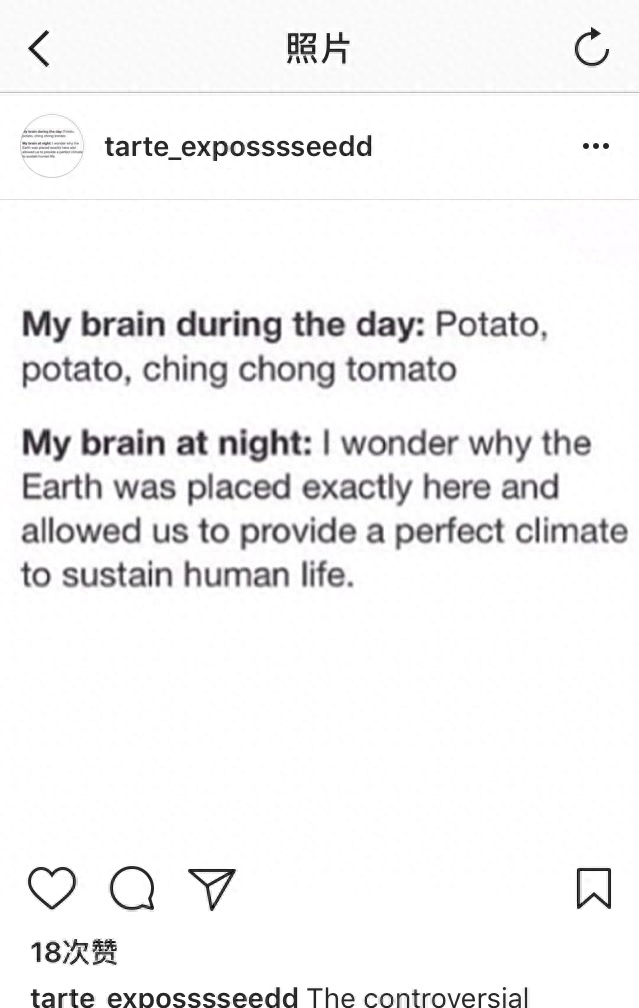 不过今日Tarte在官方ins上发了一个自以为很好笑的段子,改变了大家对她的看法,如下: