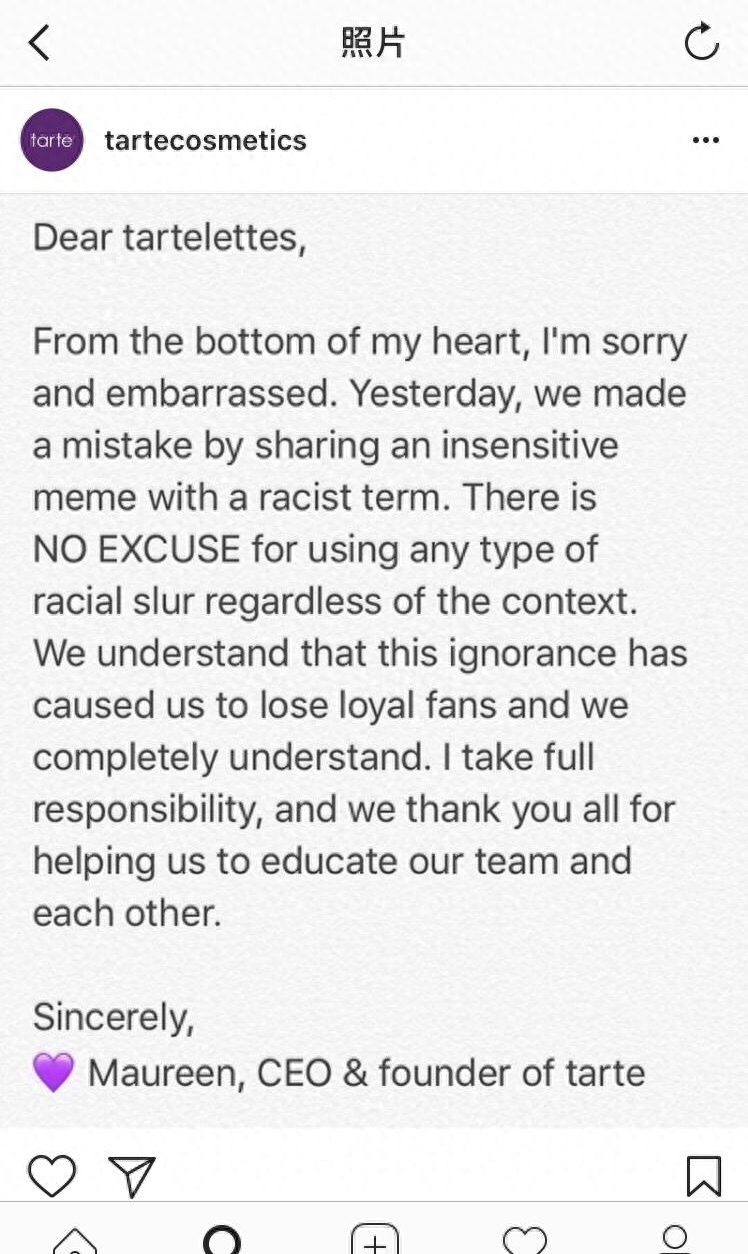 最后在很多小伙伴围攻ins,声讨Tarte言论之后,终于发布了诚挚的道歉声明。表明自己绝对没有任何歧视的倾向,当然使用不当言论是非常不对的。因为不当的言行,失去了忠实粉,团队也会吸取教训的。