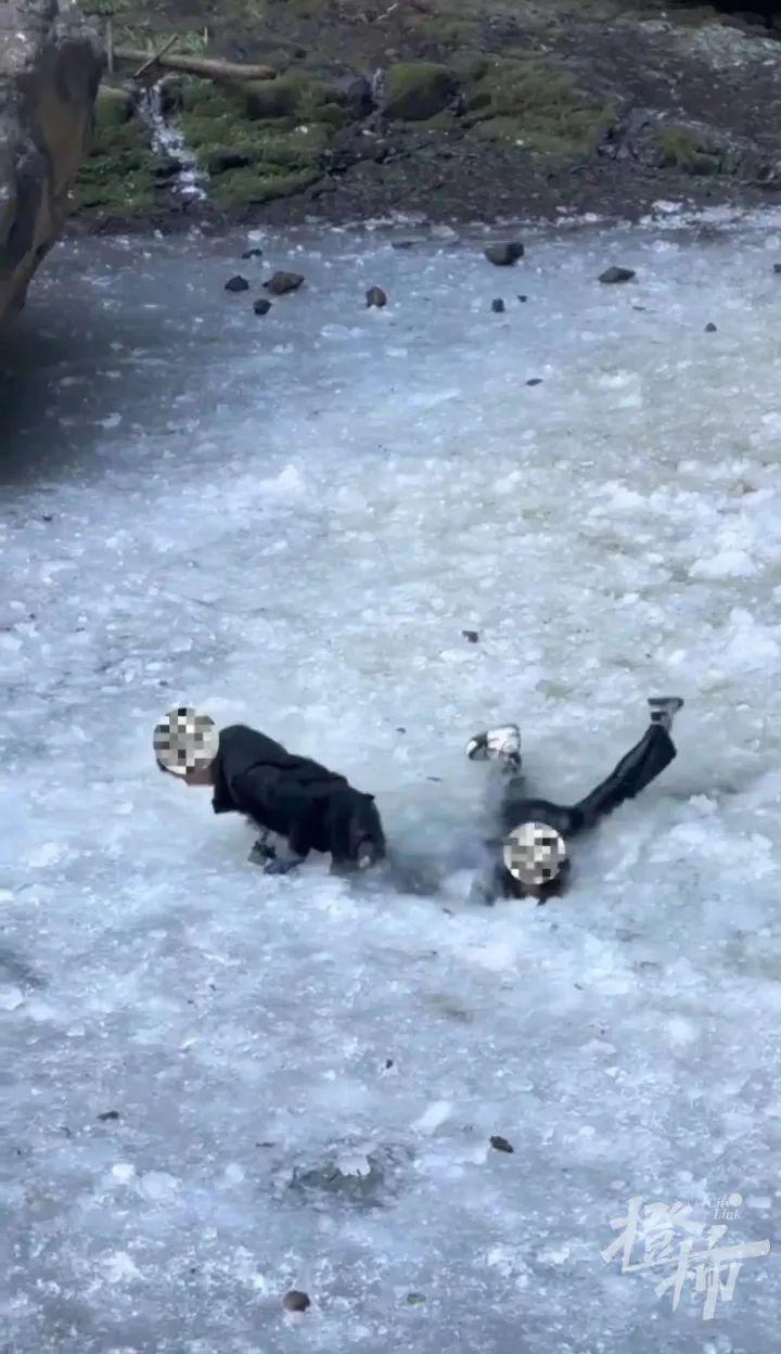 视频显示,一名女子正在冰面上拍照,突然冰块碎裂,女子掉入了冰水当中。周围游客发出阵阵惊呼声,她的同伴也赶紧伸手将其拉出冰水,女子最后成功脱险。
