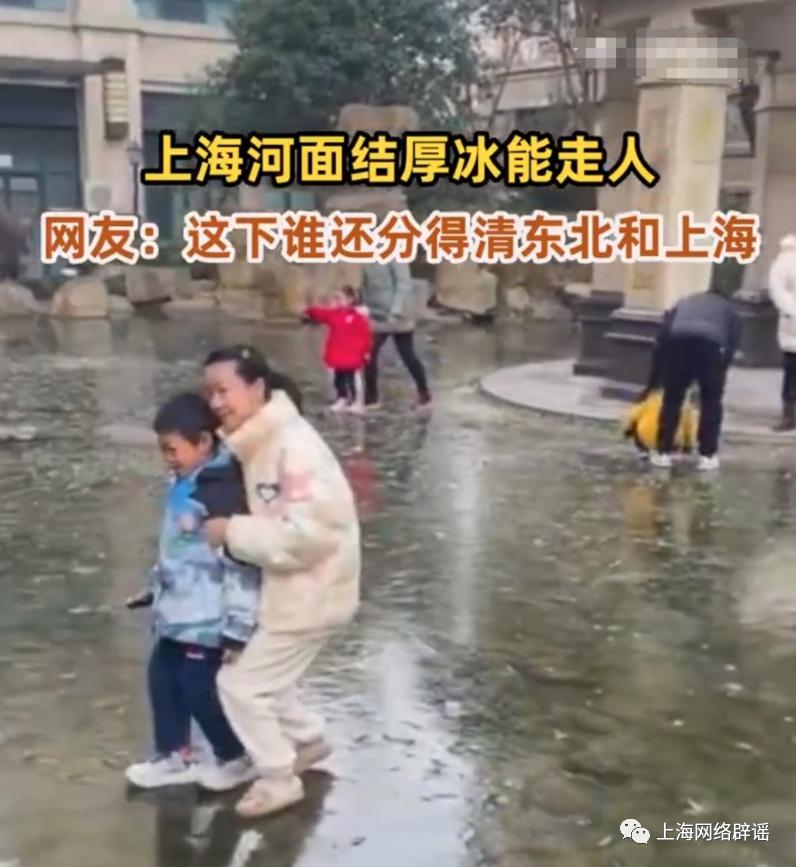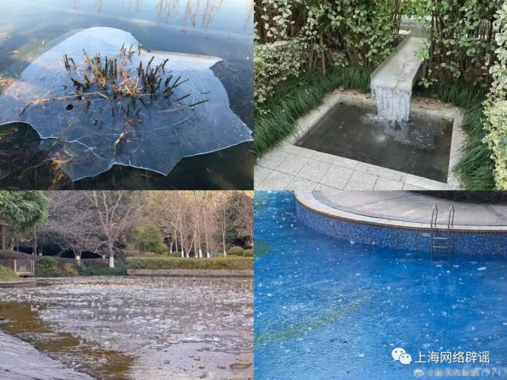 网友拍到上海近期的路面、河道、泳池等结冰的照片。