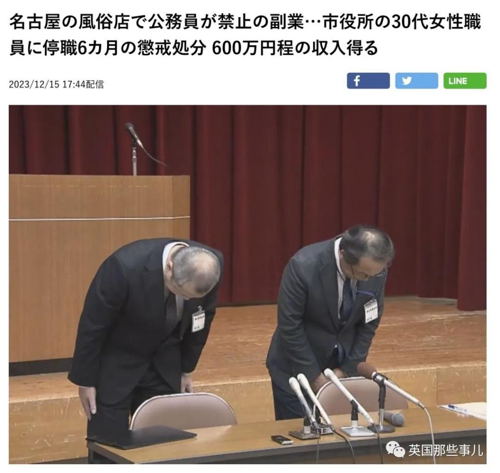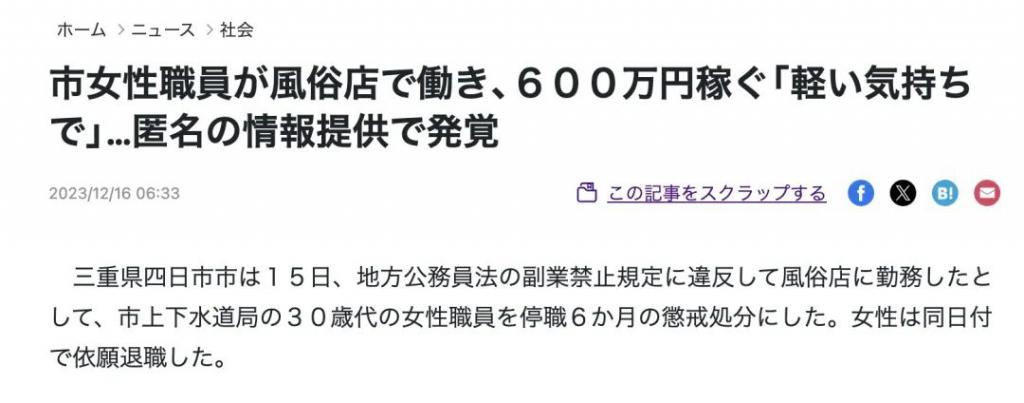 今年 12 月,三重县四日市市上下水道局的一名 30 岁女公务员,被发现在名古屋市的一家风俗店工作长达两年,总收入约 600 万日元(约 30.11 万人民币),被举报的后果就是停职六个月,而且收到处罚当天就辞职了。