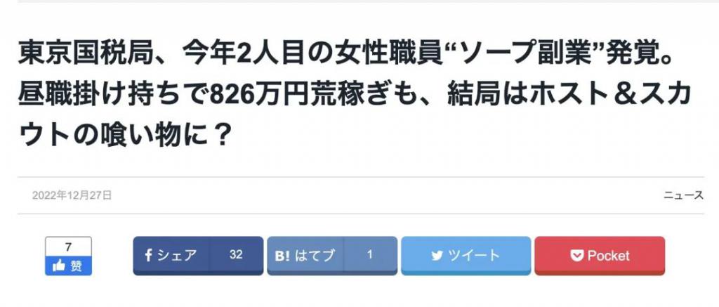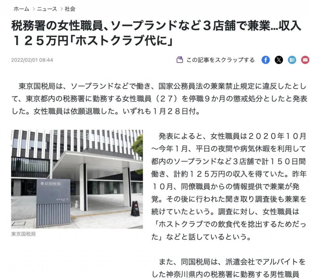 去年 2 月,一名 27 岁东京某税务局公务员被单位发现在 3 家风俗店工作,理由就是 " 去牛郎店消费 "…