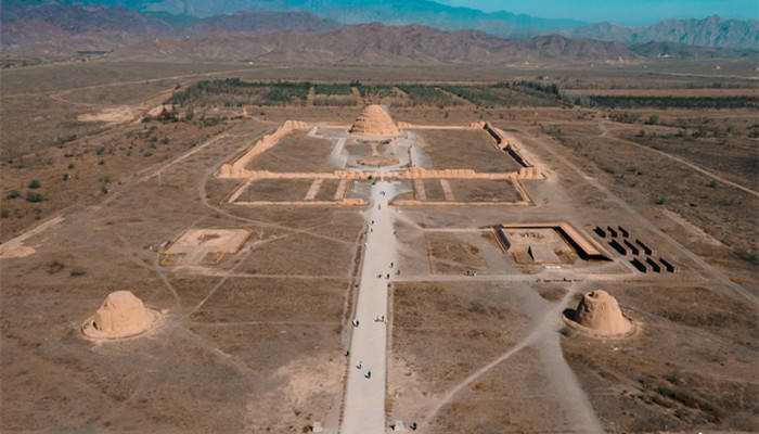 西夏王陵中帝陵共有9座,根据1990年所编号码,一号、二号、三号、五号、七号和九号陵位于平原之上,四号、六号和八号陵则依山而建。每一座帝陵均坐北朝南,呈纵向长方形,占地面积达10万平方米以上。这些帝陵的外郭形制虽然有开口式、封闭式和无外郭式三种,内部结构却大体相同,分为角台、阙台、月城、陵城四部分。这些帝陵的外郭或宫城的长宽比例都在1.5:1.7之间,与史籍记载的兴庆府城郭的长宽比大致相当。