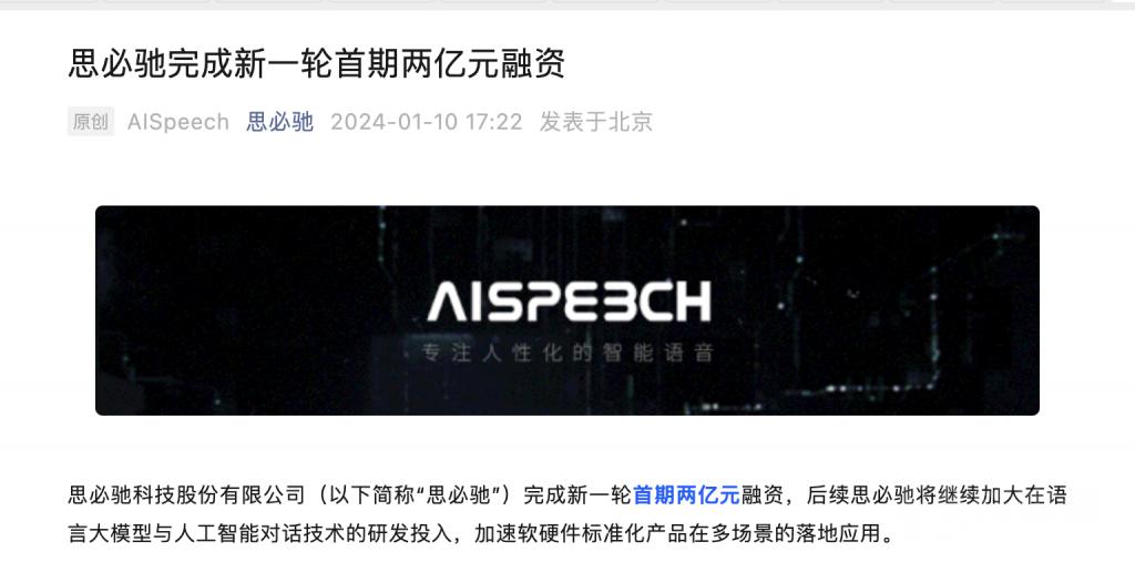 钛媒体 App 获悉,1 月 10 日下午,思必驰科技股份有限公司(以下简称 " 思必驰 ")宣布完成新一轮首期 2 亿元融资,但没有透露投资方信息。