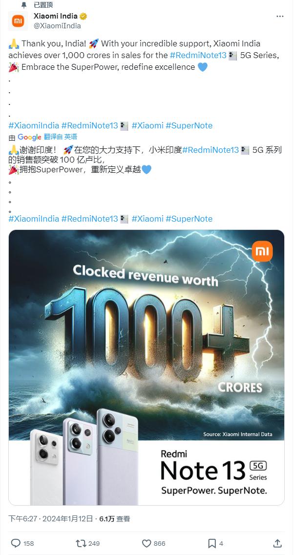 小米:Redmi Note 13 5G 系列手机在印度销售额已突破 100 亿卢比