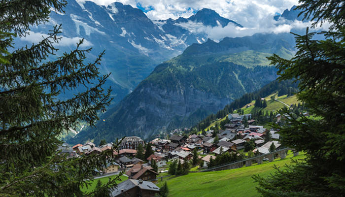 瑞士全国地形高峻,全境分中南部的阿尔卑斯山脉(占总面积的60%)、西北部的汝拉山脉(占10%)、中部高原(占30%)三个自然地形区。平均海拔约1350米,最高点是接近意大利的杜富尔峰(海拔4634米),最低点是位于提契诺州的马祖尔湖(海拔-193米)。