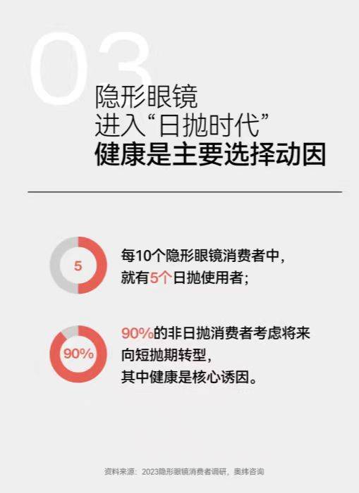 《报告》显示,在佩戴隐形眼镜的人群调查中,日抛使用人数占比呈现不断上升趋势,在日常工作场景中,人们更愿意选择佩戴健康舒适的日抛产品,日抛隐形眼镜显然已成为隐形眼镜市场大势。