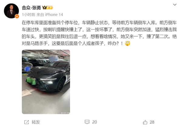 快科技 1 月 28 日消息,哪吒汽车 CEO 刚刚分享了自己的车祸遭遇,竟然在停车场被前车女司机 " 追尾 "。