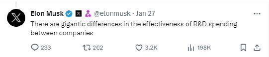 不过,马斯克的讽刺依然引发了人们对于研发投入和创新成果之间的思考。