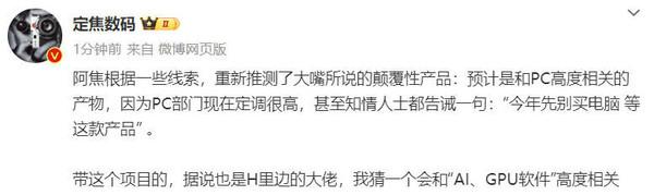 据博主 " 定焦数码 " 最新消息,预计余承东所说的是一款和 PC 高度相关的产物,甚至有知情人士透露:" 今年先别买电脑 等这款产品 " 。