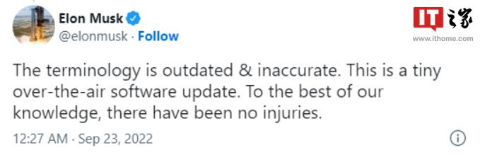 值得一提的是,特斯拉 CEO 埃隆 - 马斯克早在 2022 年便对此类 " 召回 " 提出过自己的看法。他认为 NHTSA 将 OTA 更新称作召回(recall)是 " 过时和不准确的 "," 召回 " 这个术语需要更新。