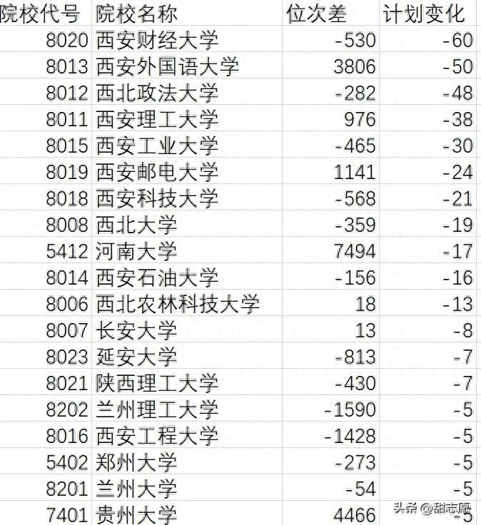 虽然招生院校数量上2023年是增加了,但总的招生计划比去年却减少119个。其中招生计划减少幅度较大都是本地院校,最多是西安财经大学,一次性减少了60个计划。